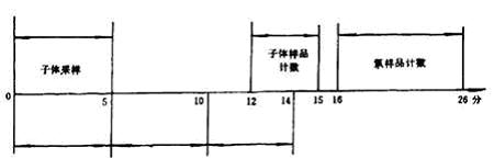 氣球法采樣系統(tǒng)示于圖4,其工作原理同雙濾膜法,只不過(guò)氣球代替了衰變筒。把氣球法測(cè)氡和馬爾柯夫法測(cè)潛能聯(lián)合起來(lái),一次操作用26min,即可得到氡及其子體α潛能濃度。其時(shí)間程序示于圖5