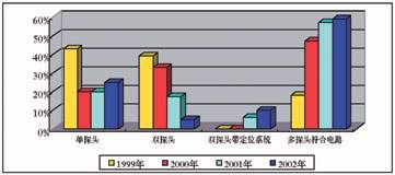 圖1 所示從1999年到2002年(2002年的數據是由上半年數據推算而來)單探頭、雙探頭、雙探頭帶定位系統(tǒng)和多探頭符合線路,四種不同核醫(yī)學設備每年各種類型所占比例?梢钥闯觥W顬槊黠@的是普通雙探頭在2002年僅僅占總數的5%,普通單探頭占總數25%,多探頭帶符合電路系統(tǒng)占總數59%。普通雙探頭帶X線定位系統(tǒng)占總數10%?梢钥闯鰡翁筋^SPECT和多探頭符合電路系統(tǒng)呈增長趨勢,尤其以多探頭符合電路系統(tǒng)更為明顯。